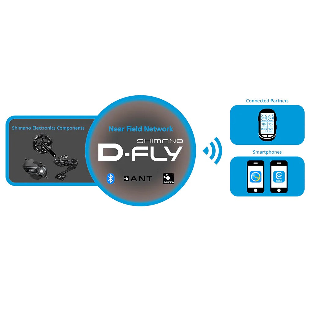 Shimano D-FLY fait le lien entre les technologies des composants et le logiciel Di2. Le D-Fly permet la connectivité entre les systèmes Di2 et les accessoires compatibles ANT+/Bluetooth®LE tels que les compteurs/GPS et les éclairages. Il offre également une connexion sans fil avec E-TUBE PROJECT Cyclist Shimano pour smartphones, ce qui permet de personnaliser la configuration du levier de changements de vitesses, de rechercher les mises à jour du micrologiciel et de résoudre les pannes de composants.