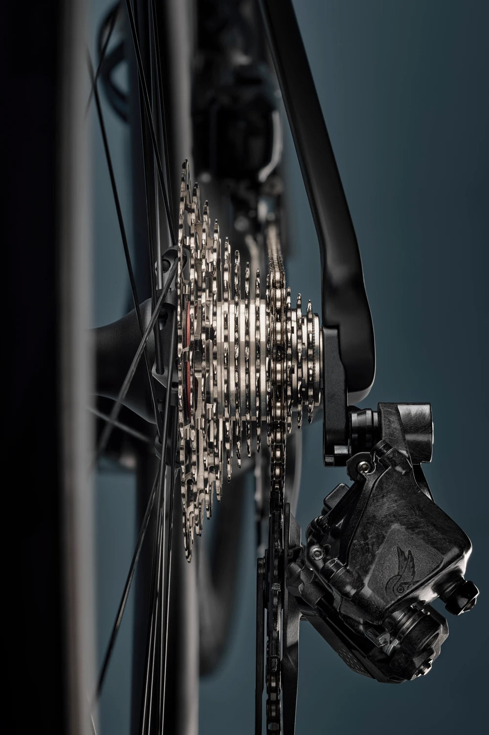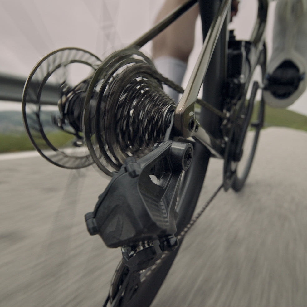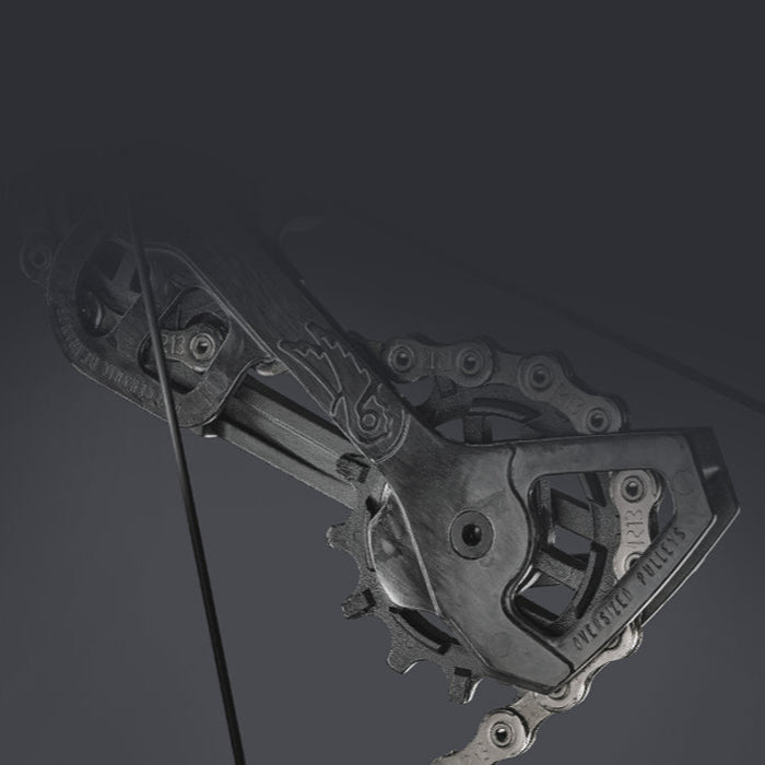 Dérailleur arrière réduit de 25 % en projection latérale par rapport à la version 12v, pour une meilleure intégration sur le cadre. Silencieux et ultra‑rapide, cage et corps en carbone, nouveau cheminement de chaîne, galets de 14 dents basse friction, roulement céramique