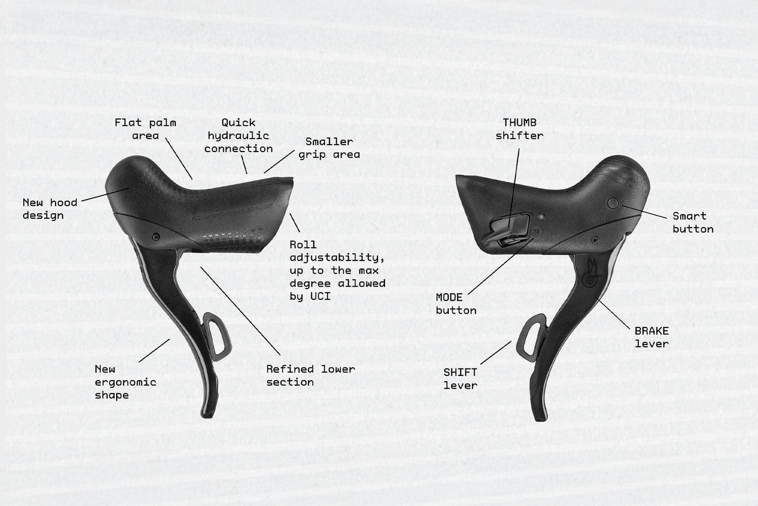 Leviers Ergopower revisités avec retour des boutons Thumb Shifter, bouton Smart Button programmable via l’application MyCampy, pour une ergonomie optimisée en position haute ou basse