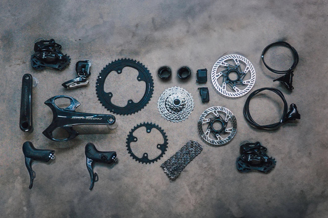 Comprend les leviers, les étriers avant et arrière, 2 disques. les manivelles et plateaux, dérailleurs avant et arrière, cassette, chaîne, 2 batteries, chargeur et câble.