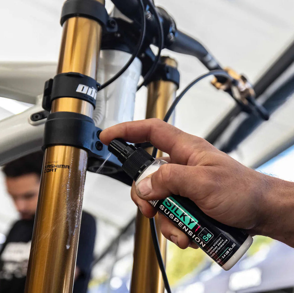 Le Lubrifiant pour Suspension MUC-OFF SILKY SUSPENSION SERUM (100 ml) est spécialement conçu pour optimiser le fonctionnement des éléments de suspension. Sa formule infusée de silicone réduit efficacement les frictions entre les joints racleurs et les plongeurs, garantissant une sensibilité accrue aux petites aspérités du terrain et un fonctionnement plus fluide.