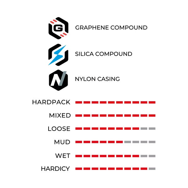 Le Martello est un pneu polyvalent qui s'adapte à toutes les conditions. Le profil des crampons permet une parfaite accroche sans compromis de vitesse, pour un pilotage technique et rapide. Le tout est associé au composé Graphène 2.0 pour une adhérence encore plus fiable, et un comportement remarquable sur sol mouillé.