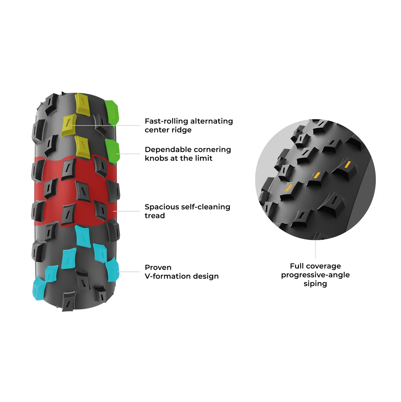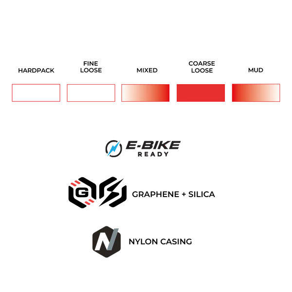 Inspirés du motocross, les crampons latéraux mordent efficacement dans les virages, tandis que l’espacement généreux et le rainurage complet garantissent une excellente traction et un auto-nettoyage constant. Grâce à sa formulation Race Graphene + Silica, le Barzo allie grip exceptionnel, durabilité et faible résistance au roulement.